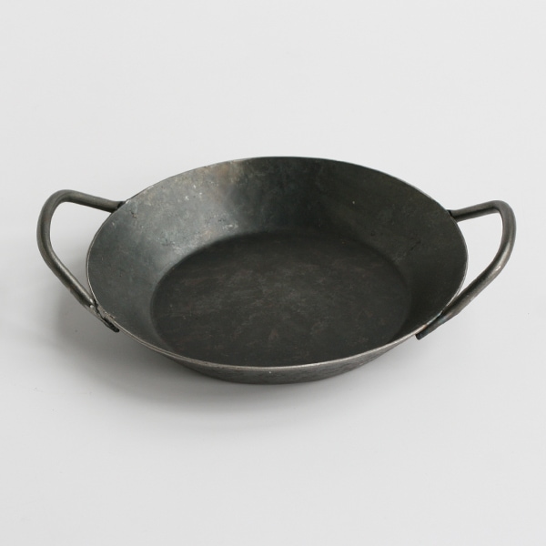鉄の塊から高温で加熱、鍛造を繰り返した後、一枚の板を何度もたたいて成型されたフライパン。