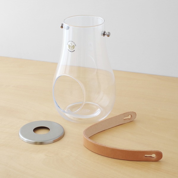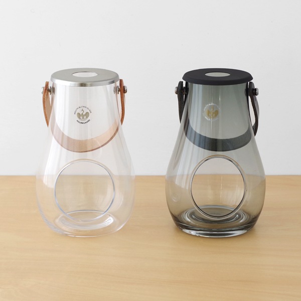 吹きガラスに本革のストラップとステンレスを組み合わせたキャンドルホルダー。
