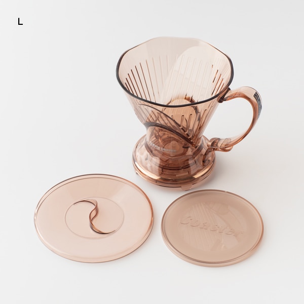 【L】W17.3×D13.5×H14.5cm 底直径:約10cm耐熱温度: 103℃ 原料: PCTG樹脂(ドリッパー)、AS樹脂(リリースリング、コースター、蓋)、シリコンラバー(バルブリング及びボール) 取り扱い上の注意: ・火のそばでの使用はお控えください。