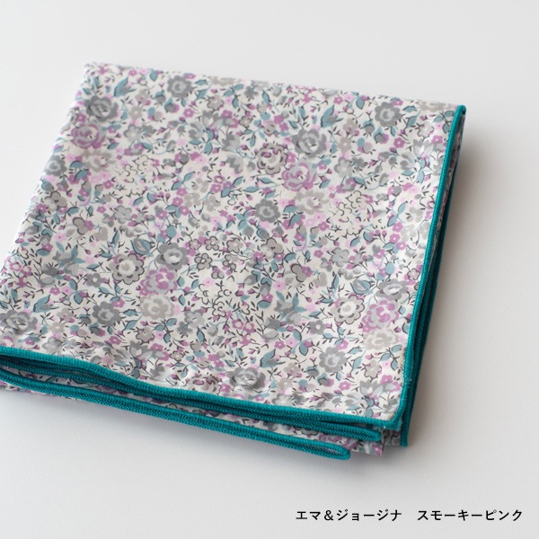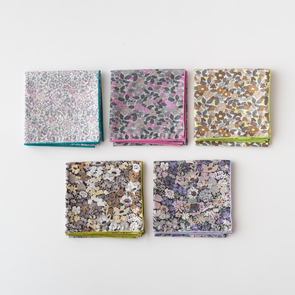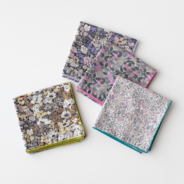 リバティ社の不動の人気を誇るアーカイブデザインをモダンにアレンジした柄「ネオン・リバティ」シリーズよりセレクトされた3柄それぞれに、異なるビビッドカラーの縁かがりがあしらわれています。