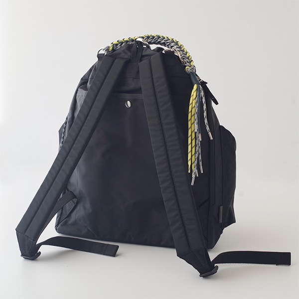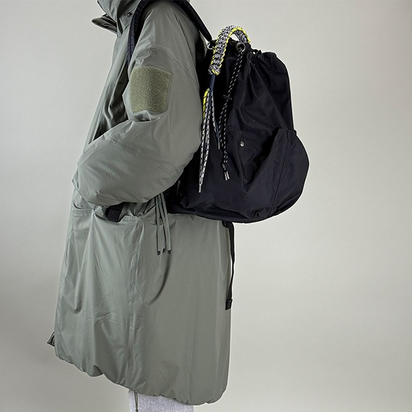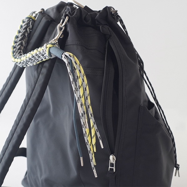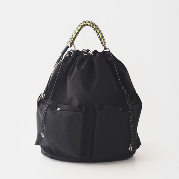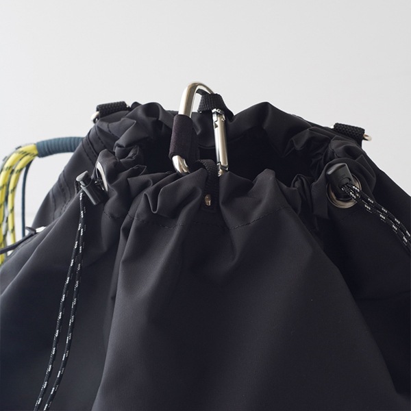 ドローストリングを引っ張って開閉するシンプルな作りで、編み込んだハンドルや間口に付けられたカラビナがアクセントになっています。ブランドについて
