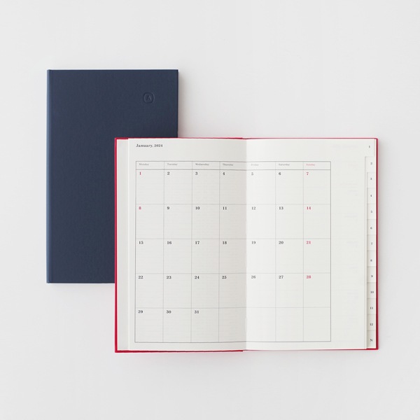 毎月のページは、1~12月までがブロック式の月間ページとレフト式の週間ページで構成されています。