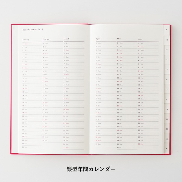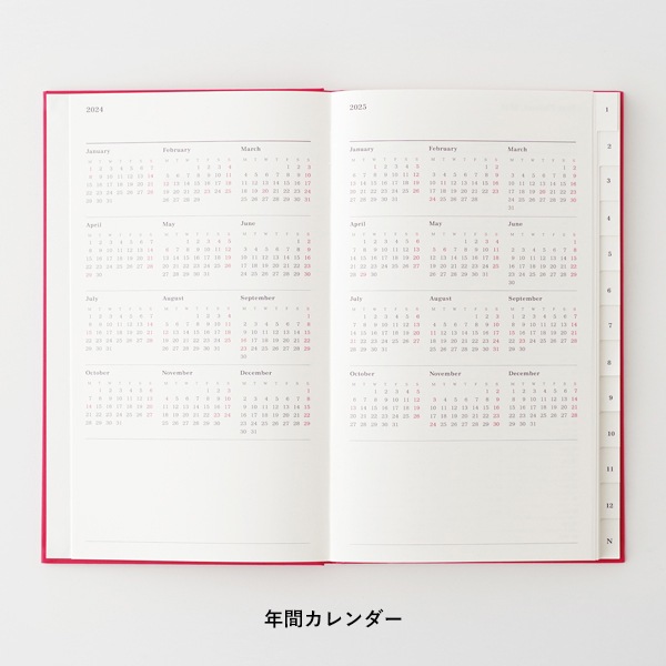 ダイアリーのトップには、当年と次年のカレンダー、縦型のイヤープランナーが付属しています。