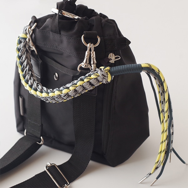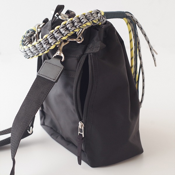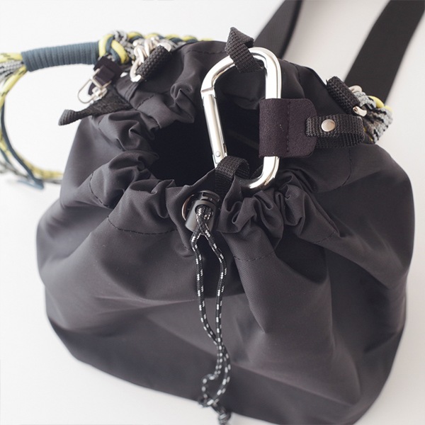 間口部分に付けられたカラビナには、小物を引っ掛けるなど、自分なりの使い方が楽しめます。