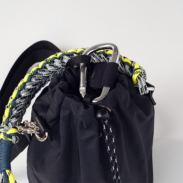 間口部分に付けられたカラビナには、小物を引っ掛けるなど、自分なりの使い方が楽しめます。